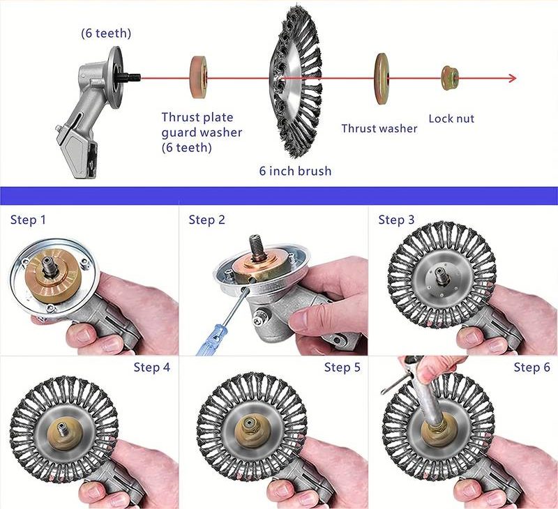 El cepillo para malezas adopta una estructura de placa fija interna para garantizar consistencia y seguridad. Más nítidos y eficientes que otros tipos. Larga vida útil y durabilidad El cepillo para malezas está hecho de alambre de acero al carbono y puede funcionar correctamente al golpear piedras y bloques duros. La vida útil será 10 veces más larga que la de otros cabezales de corte. El cepillo para malezas es adecuado para la mayoría de los modelos de máquinas de podar y es adecuado para productos de herramientas de poste de jardín de eje recto.