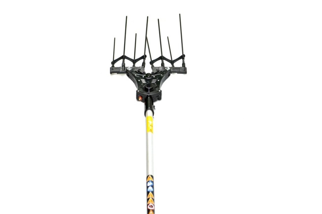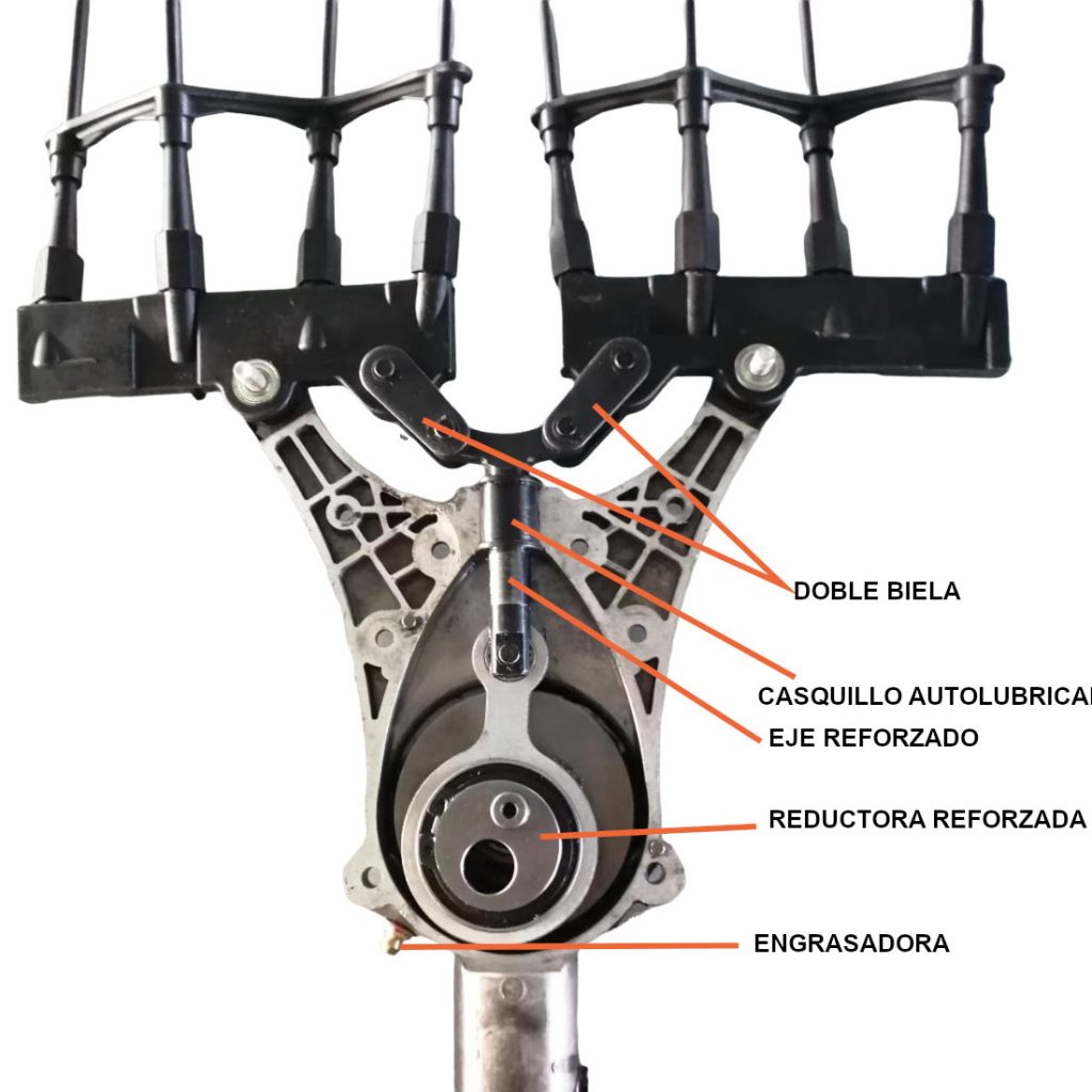 Cabezal de vareadora nueva versión mejorada y reforzada. Fiable y muy resistente. Caja reductora ligera de sistema oscilante. Varillas de fibra de carbono en V que aumenta considerablemente el ancho de trabajo. El casquillo dispone de un nuevo sistema de doble biela que evita que se cruzen las varillas en cualquier condición.