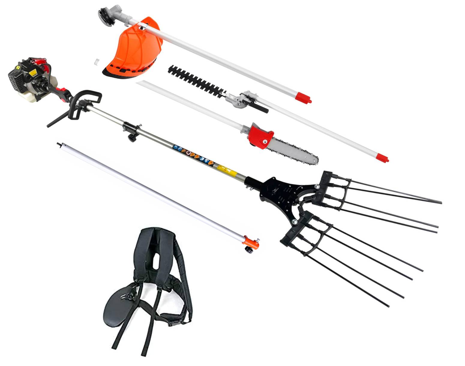 Vareador de aceitunas de gasolina con podadora, desbrozadora y cortaseto